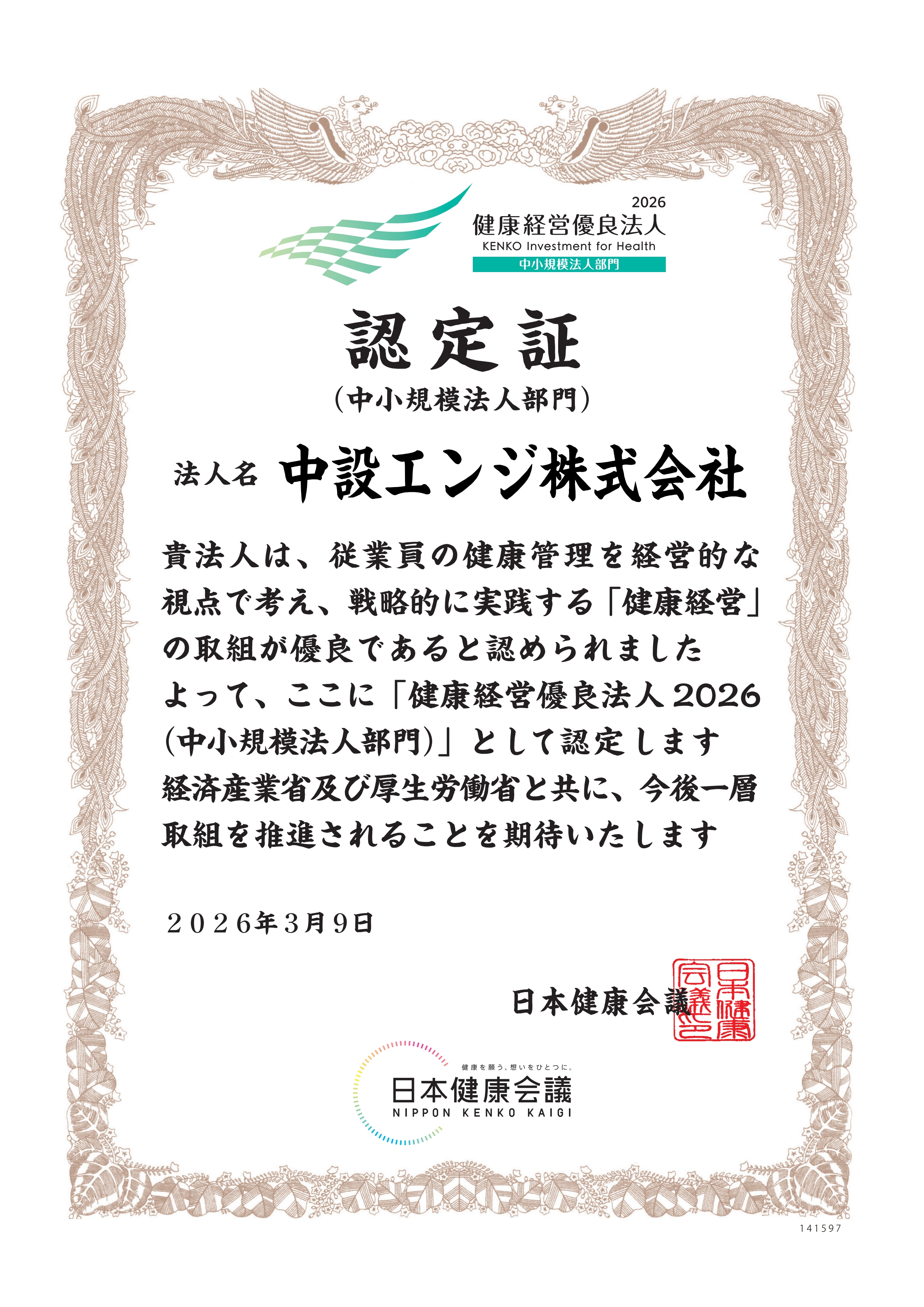 中設エンジ株式会社は2026年3月9日、経済産業省および日本健康会議が共同で選定する「健康経営優良法人2026(中小規模法人部門)」に初めて認定されましたので、お知らせいたします。